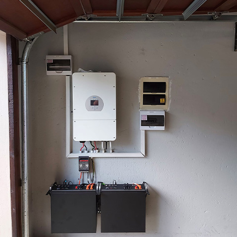 An off-grid solar system is generally installed for remote properties where the cost of connecting to the main grid is prohibitive or not financially viable. The solar system charges a battery bank which in turn is used to power all your appliances and lights etc. A generator may be used as a backup to the battery system for added security, if so required..